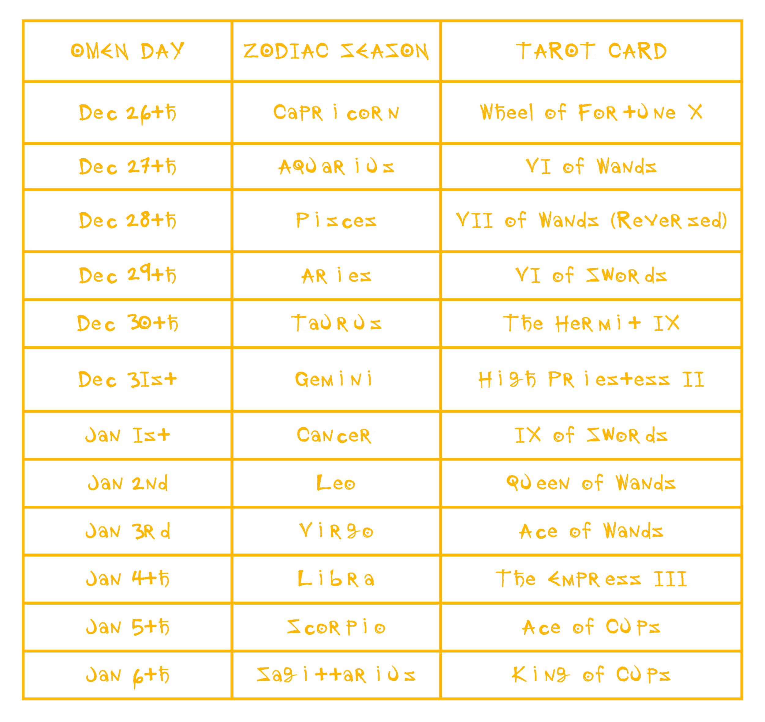 Naturally, I’ve tinkered with the system a little, and have assigned my 12 Omens to each Season of the Zodiac instead of the Gregorian Calendar. I drew a Tarot card for each Season too, in order to help me remember the Omens and perhaps help me to find their meaning.